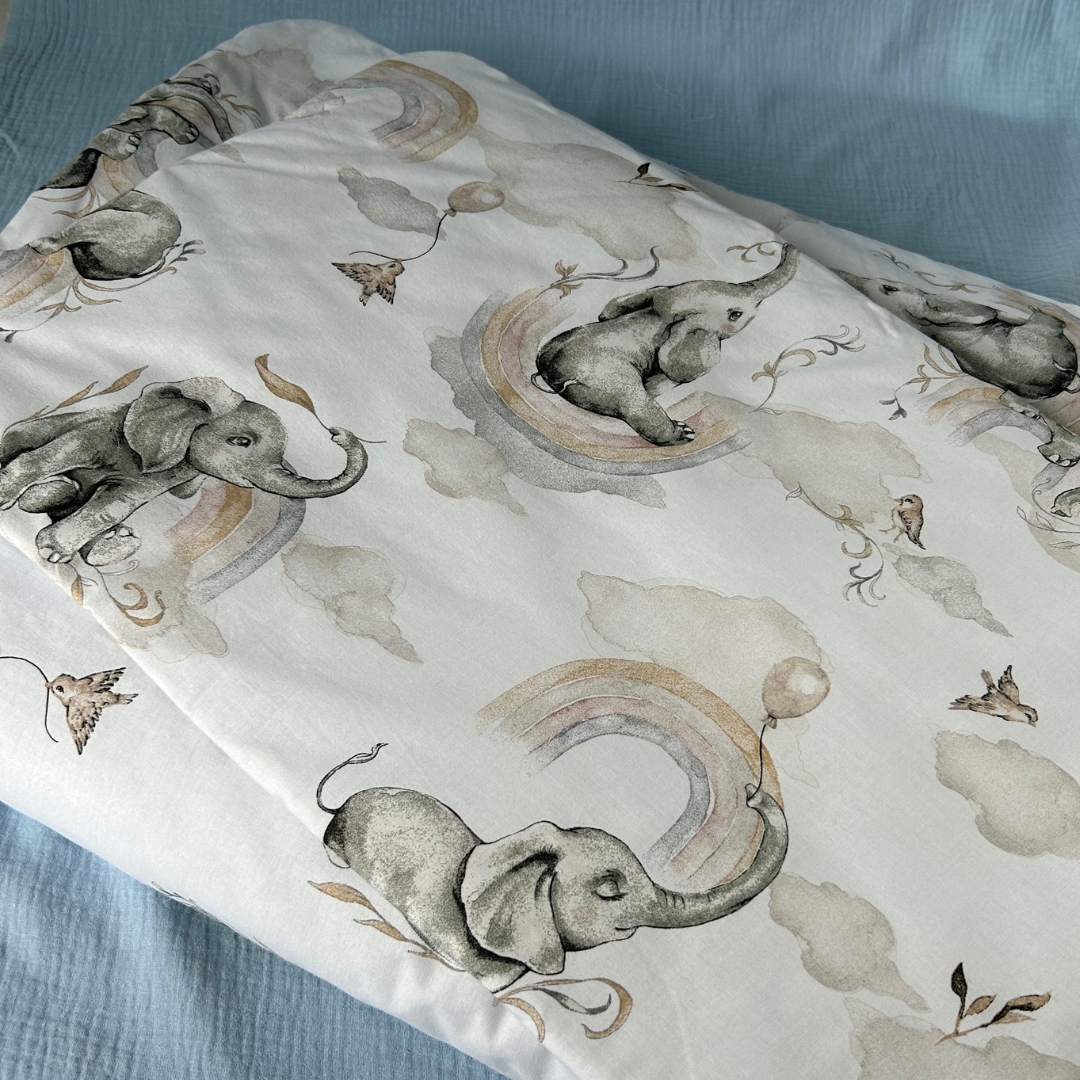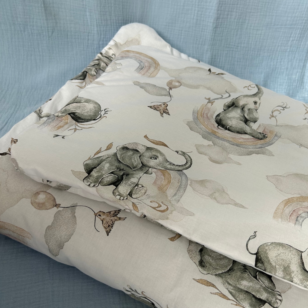 Zapewnij swojemu dziecku komfortowy i spokojny sen dzięki naszemu kompletowi pościeli Słoniki. Kołderka 100x135 cm i poduszka 40x60 cm zostały stworzone z myślą o najmłodszych, oferując idealne rozwiązanie zarówno do łóżeczka, jak i jako pościel do przedszkola czy żłobka. Silikonowe wypełnienie i pokrycie ze 100% bawełny sprawiają, że pościel jest idealna dla delikatnej skóry dziecka, zapewniając jej bezpieczeństwo i komfort przez całą noc.