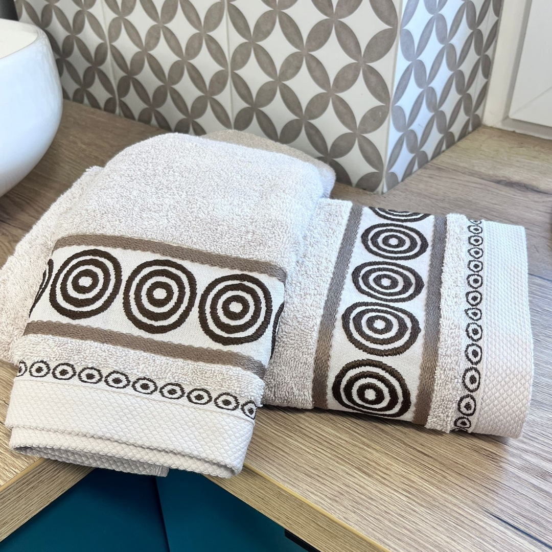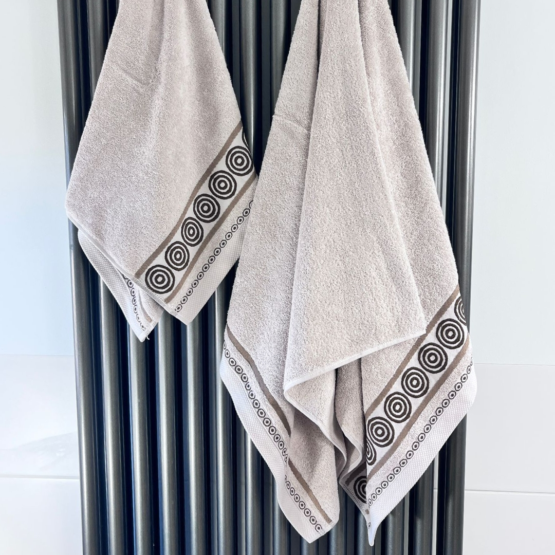 Stylowy komplet ręczników bawełnianych w beżowym kolorze z subtelnym wzorem koła to idealny wybór do Twojej łazienki. W skład zestawu wchodzą ręcznik kąpielowy oraz ręcznik do rąk, wykonane z najwyższej jakości 100% bawełny. Miękkie, chłonne i trwałe ręczniki sprawdzą się w codziennym użytkowaniu, a ich neutralny design będzie pasować do każdego wnętrza. Komplet to także świetny pomysł na praktyczny prezent.