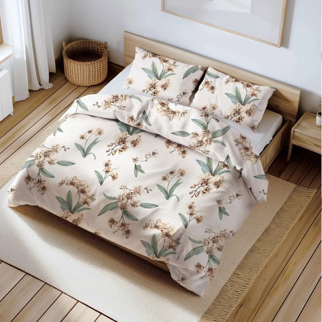 Komplet pościeli 160x200 Storczyki beż to modny dodatek do Twojej sypialni. Przewiewna, miękka, przyjemna w dotyku i trwała pościel, posłuży Ci przez wiele lat. Kwiatowy wzór w odcieniach beżu i zieleni sprawi, że dopasujesz ją do każdego stylu sypialni.