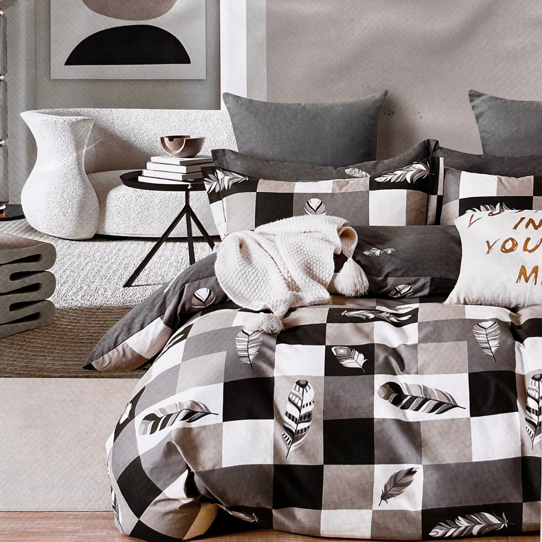 Komplet pościeli z bawełny satynowej z nadrukiem kraty i piór sprawdzi się w każdej nowoczesnej sypialni.