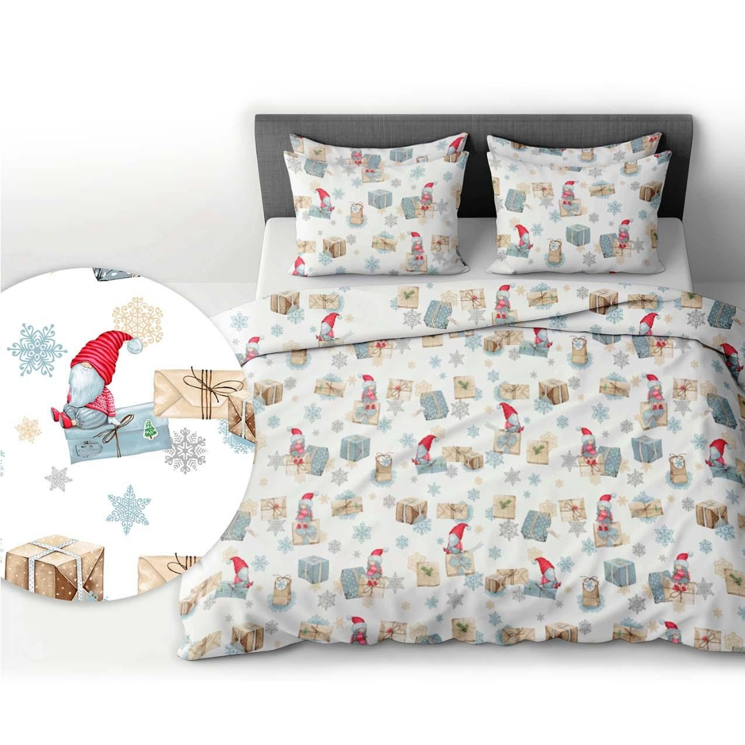 Pościel bawełniana 160x200 z nadrukiem Mikołajów, prezentów i małych skrzatów to doskonały sposób na stworzenie przytulnej, świątecznej atmosfery w sypialni. Jasna kolorystyka z elementami wesołych, świątecznych grafik ożywi wnętrze i wprowadzi radosny klimat na czas świąt.