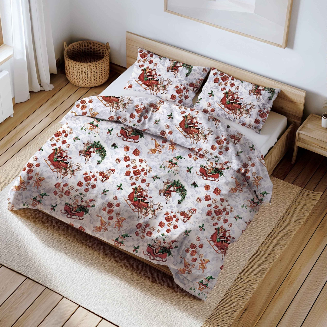 Pościel świąteczna w sanie MikołajaWzór pościeli bawełnianej świątecznej w sanie Mikołaja