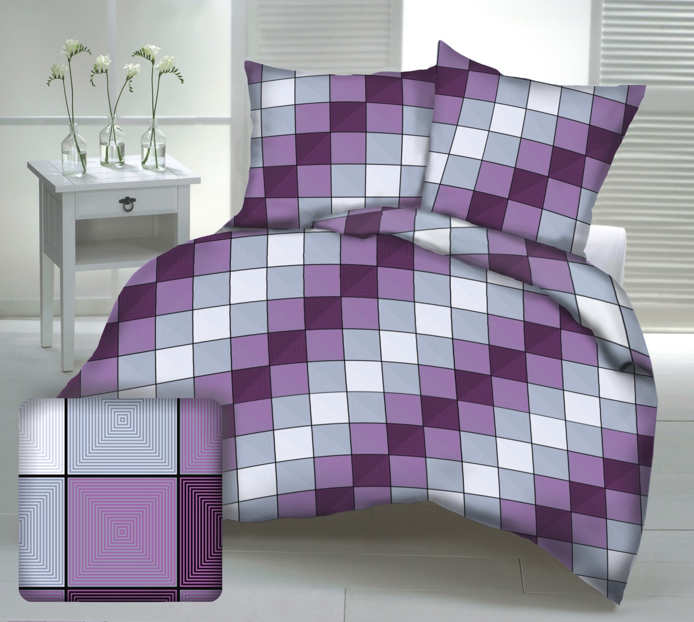 Wzór pościeli w kratę w odcieniach fioletu, idealnie sprawdzi się w młodzieżowym pokoju czy nowoczesnej sypialni.